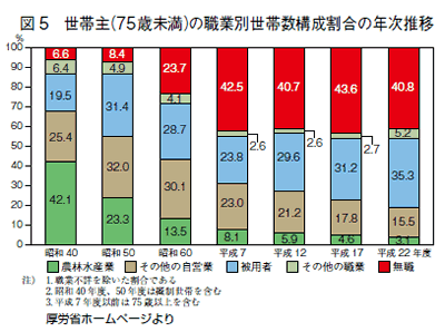 多くの方が“無保険”になり、手遅れになるまで受診できなかった理由のひとつは、高すぎる国保料(税)にあります。国保は、国民の約三割が加入する最も 大きい医療保険。もともとは自営業者や低所得者向けの医療保険として始まりましたが、雇用状況の悪化とともに、無職・非正規雇用などの加入者が増えてきた という背景があります(図5)。国保は加入者の支払う保険料だけでは、成り立たない制度なのです。