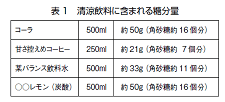 現在の食環境は、砂糖と切っても切れない関係にあります。お菓子やジュースだけではなく、料理や薬(ドライシロップなど)にまで使われています。おいしいものには、ほぼ砂糖が入っているといっても言いくらいです(表1)。もともと成人が1日に摂取する糖分の適量は50グラム(角砂糖16個分)と言われています。