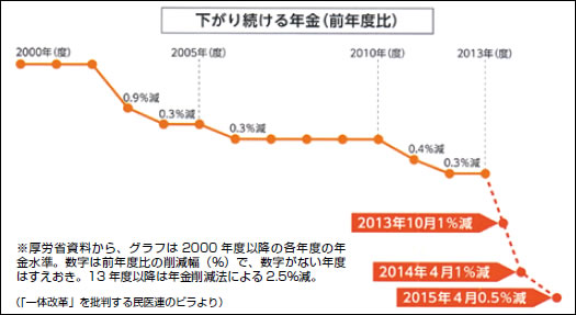 年金も、この一〇月から一カ月あたり約二〇〇〇円切り下げられます(厚生年金の受給者)。振り込み額が減額されるのは、一二月一五日振り込み分からで す。「これほどまでに削減するのか」という国民の怨嗟の声があふれるでしょう。