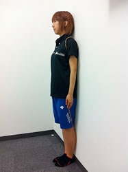壁に後頭部、肩甲骨、臀部をつけて、チェックしてみましょう。背中(おへその真後ろ)にすき間はできていないでしょうか。両肩は浮いていませんか。頭は 後頭部がついていますか。頭頂部(つむじの辺り)がついてあごが上がっていないでしょうか。日常生活の中で、いい姿勢をとるように心がけましょう。