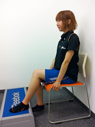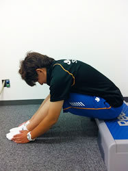 転倒しやすい方は、座っておこないましょう(写真(6))。台の上などに腰を下ろし、膝を少し曲げ、反動はつけずに、背中もなるべく曲げないように、上半身の重みでゆっくりと前に倒れていき、胸を太ももの前面につけるようにしましょう。