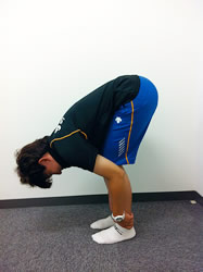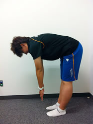 「腰痛=腰が弱い」と考えて、何でもかんでも筋力トレーニングをするのは感心しません。腰痛を抱える患者さんの多くは、ハムストリングと呼ばれる太ももの後ろの筋肉の柔軟性が低下するために、写真(4)のように、床に手がつきません。これを「タイトハムストリング」と言います。