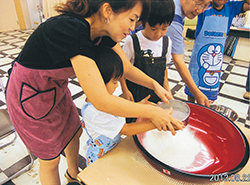 八月二二日、「夏休みそば打ち親子教室」が開かれ、親子五組が参加しました。参加者は友の会のそば打ちサークルの方々に指導を受けながら、大汗をかいて大奮闘でした。