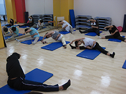 指導員の方から、マットに座ってのストレッチや、踏み台を使った運動のしかたを習いました。「体を前に倒すのは無理のない範囲で」「膝や股関節の痛い方 は椅子に腰掛けたままでいいですよ」など、優しく丁寧な指導のもと、楽しく身体を動かしました。