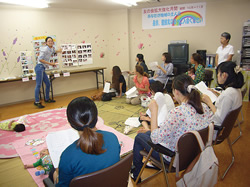 九月二六日、一三組の親子が参加して、「赤ちゃんの食の話」をテーマに学習会を開きました。みつばち保育園の調理部の方を講師に、離乳食の作り方を講習。生後五カ月ごろからあたえる野菜スープの作り方などを学びました。