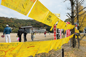 愛媛医療生協も屋台を出し、組合員さんによる「ばら寿司おにぎり」を販売、健康チェックコーナーも設けました。同法人では集会にむけて、全支部・職場が 黄色いハンカチに脱原発への思いを寄せ書きする「黄色いハンカチ運動」を実施。この日も「子どもに明るい未来を」「再稼働やめて」などのメッセージが書か れたハンカチが、会場を彩りました。