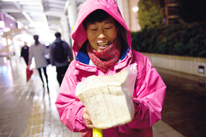 昨年一二月一九日、午後九時。東京・健生会の職員や立川市議会議員など、あわせて五人が集ま り、立川駅周辺の夜回りをおこないました。二〇一〇年から「路上生活者を支えよう」と始まったもので、月一~二回実施。路上生活者と思われる一人ひとりに 声をかけ、食料や衣類の提供、生活保護申請の援助などをおこなっています。