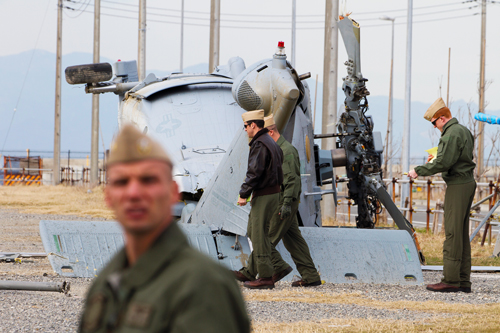 | 昨年12月16日、神奈川県三浦市に不時着した米軍ヘリ。全国どこでも同様の事故は起こりうる(写真=野田雅也) |