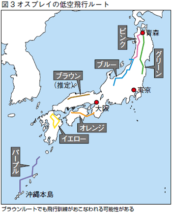 沖縄の普天間基地に新型輸送機オスプレイが配備される際、米軍は初めて六つの低空飛行ルートがあることを認めた(図3)。しかしあくまでも「基本」で、それ以外でも訓練するというのが米軍の立場だ。全国どこでもオスプレイなどの米軍機訓練がおこなわれる可能性がある。