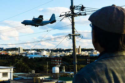 民家の屋根すれすれに米軍機が離着陸し、騒音で会話が中断する。夜、ホテルに帰ってからも、エンジンやプロペラの回転で発生する低周波音が、耳について 離れなかった。