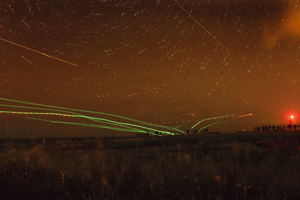 | オスプレイの夜間訓練の光跡。暗い空に無灯火で進入して来るときには不気味な音しか聞こえず、機数は確認できない(伊江島演習場2013年12月3日) |