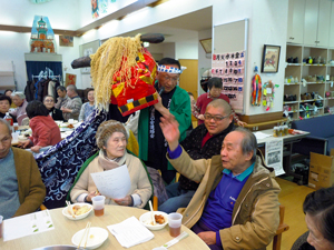 各団体の出し物に拍手喝采したあと、森尾嘉昭・浅野健康友の会長と普照明典・城北クリニック事務長が扮する獅子が登場。「この獅子がみなさんの具合の悪 いところを噛むと必ず良くなります」と言いながら、各テーブルを回りました。「腰が痛い」「若くなりたい」などの声がかかり、その都度テーブルから笑いと 歓声があがりました。