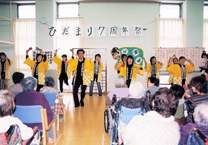有料老人ホーム「ひだまり」が七周年を迎えました。二月八日、入居者や家族、職員やボランティアが会場いっぱいに集まり、みんなでお祝いをしました。
