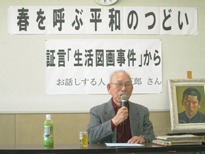3月15日、「春を呼ぶ平和のつどい」を開き、戦時中に起きた「生活図画事件」の当事者である松本五郎さん(93歳)からお話を聞きました。
