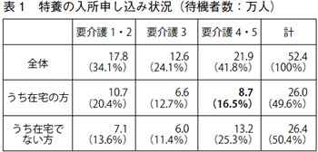 当初は、特別養護老人ホーム(以下、特養)の新規入所を「要介護3以上に限定する」という案が 示されていました。特養に入所を希望しながら入所できず「待機者」となっている五二万人のうち、要介護4・5の在宅待機者(約八万七〇〇〇人)の入所を優 先させたいというのが政府の説明です(表1)。