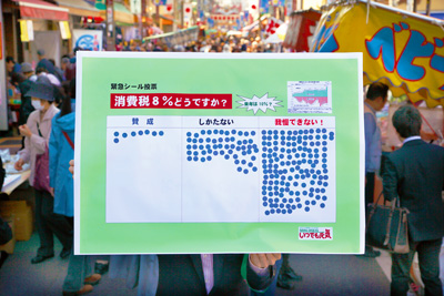 「消費税が八%に上がりましたが、実感はどうですか?」と聞きながらシール投票を実施。やはり多かったのは「我慢できない」一四五票(六九・一%)でした。