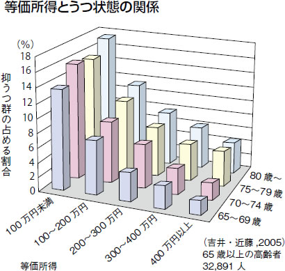 65歳以上の高齢者のうち、等価所得(注)が低くなるにつれて、うつ状態の方の割合が高くなるというデータがあります(図)。教育を受けた年数が少ないほど、高齢期の咀嚼力が弱くなる傾向も明らかになっています。