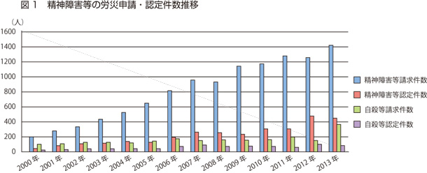 それに比べ、精神障害と過労自殺の労災請求件数は1409件と、前年度に比べて152件の増加で、過去最多でした(図1)。
