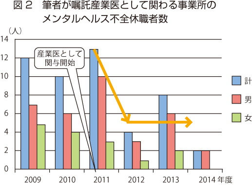 また、長時間労働者の比較的多い職場を優先的に、職場巡視をおこないました。すると、年間の新規メンタルヘルス不全による休職者は、2012年4人、2013年8人、今年7月までに2人の発生まで減少しました(図2)。