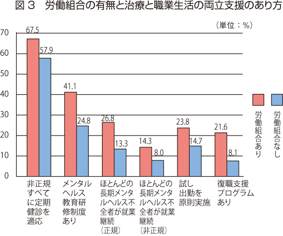 「『治療と職業生活の両立等の支援に関する検討会』報告書」(厚生労働省労働基準局、2013年)の結果を見ても、労働組合のない職場に比べて労働組合 のある職場の方が、メンタルヘルス不全の治療と職業生活の両立支援度が高くなっています(図3)。