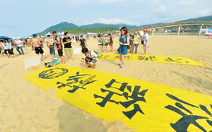 | 第4原発近くの海水浴場でおこなわれた「海洋音楽祭」の会場で、原発閉鎖を訴える緑色公民行動連盟の若者たち。応じた人たちが横断幕にメッセージを書き込む(7月12日) |