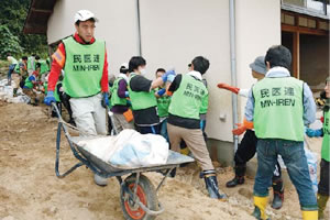 長野・諏訪共立病院から支援に駆けつけた清水浩紀さん(事務)は、「被災から二週間経っているのに、爪痕が生々しい。復旧のために、まだまだ人手が必要 だと思った」と衝撃を受けたようす。「(二〇年前に鹿児島で起きた)8・6水害支援の恩返しのつもりで来た」という鹿児島医療生協の倉元あゆみさん(事 務)は、「土のうの数を見たときには『作業は終わるのかな』と思ったけれど、みんなの力ですぐに片付いた。坂を上って行くときに後ろを振り向いたら、民医 連の緑のビブスが連なって見えて、みんな同じ思いでつながっているのだと実感した」と話してくれました。