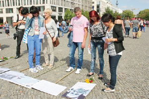 八月一四日、夕方の四時少し前に警察官が数人やって来て広場にスペースをつくると、プラカード や横断幕を持った人びとが次々と集まってきました。ベルリン在住の日本人グループ「ベルリン・女の会」の呼びかけで集まった日本人・韓国人・ドイツ人など 約五〇人。プラカードや横断幕が広場いっぱいに並び、世界各地からやってきた人びとの目を引きます。