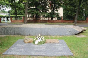 | ポツダム市の湖畔に設けられた「ヒロシマ・ナガサキ広場」の追悼碑。追悼文はドイツ語、日本語、英語の3カ国語で書かれている |