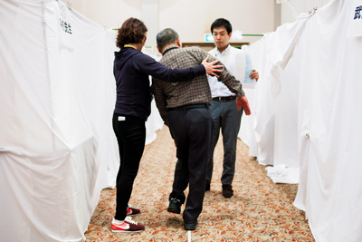 谷川智行医師(東京・中野共立病院)は、筆やコンパス状の針でTさんの手足の先に当て、感覚障害を調べた。試しに、私の指先に刺すと、瞬時に痛みを感じる。しかしTさんには、“何かが触れている”程度にしか感覚がない。検診では床の上に引かれた白線に沿ってまっすぐ歩くようにうながされたが、ふらふらとして、両脇を支えられながら足を前に出すのがやっとだった。