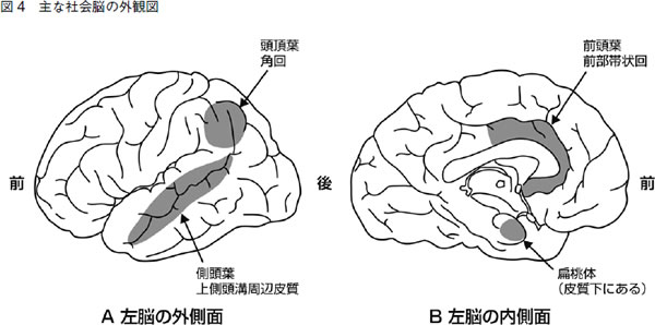 脳科学研究の新しい潮流、社会脳科学では「社会脳」という考え方で人間の心理や行動を説明しています(図4)。社会脳は主に前頭葉を中心とするエリアに存在し、「人への関心を持つ」「人の気持ちを理解する」「人の苦しみをわが苦しみとする(同情・共感)」「欲望を抑え理性的な判断をする」「協調性を保つ」「物事を自制・我慢する」「自分の言動を反省する」などの働きを担っています。社会性や協調性は、社会脳の最も大切な働きで、前頭葉(前部帯状回)に宿っていると考えられています。正解は(1)です。