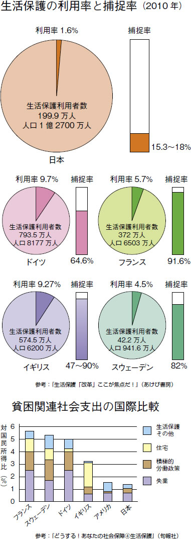 生活保護制度の利用者が二一六万人を超えて過去最多になったと言われますが、人口全体から見た利用率は一・七%。一九五一年の二・四%と比べても、三分の二にすぎません。ほかの先進国と比べても、日本の利用率は高くないのです。