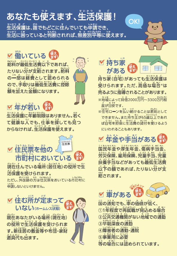 この機会にあらためて生活保護制度について知っていただき、生活に困っている方々には制度の利用を促したいとの思いから、このパンフレットをつくりました。
