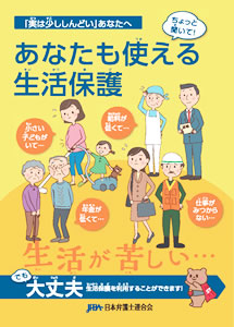 日本弁護士連合会(日弁連)が、パンフレット「あなたも使える生活保護」(A5版・8頁)を発行しました。「生活保護は、誰でもどこに住んでいても申請でき、生活に困っていると判断されれば、無差別平等に使えます」と、生活保護制度の利用を促す内容です。