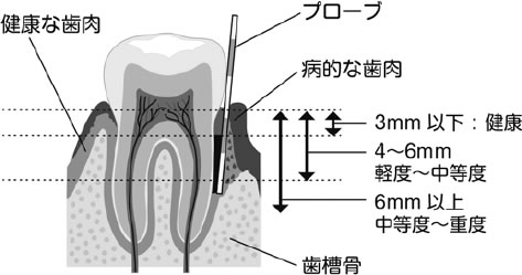 歯と歯肉の間の溝は、炎症によって深くなります(図1)。この深さを測定することで歯周病の進行具合を調べます。一般的に3ミリ以下は健康な状態です。4ミリ以上になると歯周ポケットと呼ばれ、歯周病の可能性があります。同時に歯肉からの出血の有無や、歯の根の形、根についた歯石の状態などを調べます。歯のぐらつきも確認します。