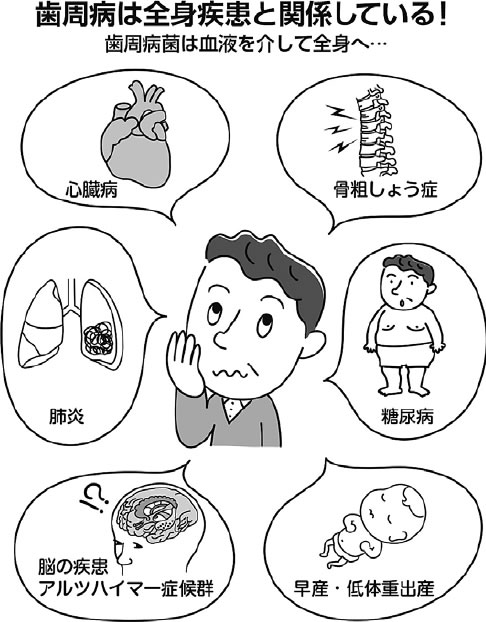 また、歯肉の炎症が全身に多くの影響を与えることが明らかになってきています。近年、狭心症・心筋梗塞・脳梗塞・糖尿病・誤嚥性肺炎・骨粗しょう症などの病気と歯周病との関連性がわかってきました。毎日の食生活を含めた生活習慣を見直し歯周病を予防することが、全身の生活習慣病を予防することにつながります。