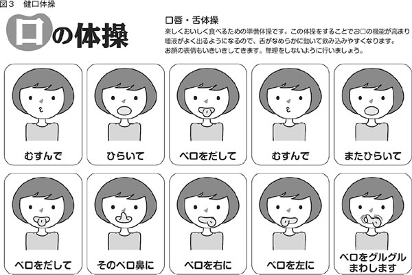 健口体操(図3)は、(1)食物を噛んだり、飲み込んだりする力を鍛え、誤飲を防ぐことに役立つ、(2)唾液腺をマッサージし、刺激して唾液の分泌を促す、(3)手や指・口を動かして脳を刺激するため、脳細胞が活性化される、(4)発声や歌で口やのど・肺を使い、のどの力や肺活量の維持向上に役立つ、などの効果があります。