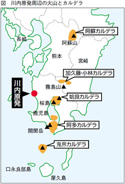 今年五月に噴火した口永良部島をはじめ、南九州は桜島、霧島など活火山が多く、火山の巣とも言える危険地帯。火山の大爆発でできた大きな窪地をカルデラといいますが、川内原発の半径一六〇キロメートル以内には、桜島の姶良カルデラなど五つのカルデラがあります(図)。