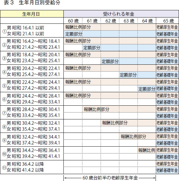厚生年金は国民年金と同じく65歳支給開始ですが、特別に60歳から65歳まで年金が支給されています。これを「特別支給の老齢厚生年金」といいます。しかし、この年金は順々に削減されていくスケジュールの真っ最中なので、生年月日によって受給のスタイルが異なりますから複雑です。表3からご自分のスタイルを探してみましょう。
