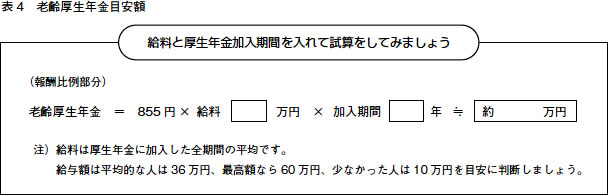 入社から退社まで同時期の同僚でも、(1)~(4)のどれかが違うと年金額が変わるという訳です。現役時代の違いが老後の年金額の差になる仕組みです。少々難しいですが、老齢厚生年金のおおまかな額を表4をつかって計算してみましょう。