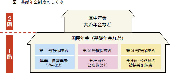 現在の公的年金制度は「基礎年金制度」と言い、一階部分の国民年金と二階部分の厚生・共済年金からなる「二階建て」の仕組みです()。つまり厚生・共済年金の人は国民年金と二重加入していることになります。したがって、日本に住む20歳以上60歳未満の人は、みんな国民年金に加入しています。年金を受けるときは「国民年金」と言わずに「基礎年金」と言います。