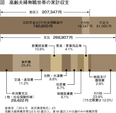 総務省の調査によると、高齢夫婦二人世帯の一カ月の生活費は平均二七万円です。仮に厚生年金に加入していて、月々二一万円の収入があっても月に六万円が不足します()。貯金が三〇〇万円なら四年、一〇〇〇万円でも一四年しかもちません。