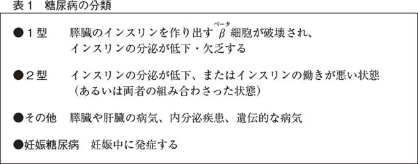糖尿病の種類は、4つに分けられます(表1)。日本人の糖尿病患者の約95%は2型糖尿病です。原因として遺伝的要因と環境的要因が混在しています。日本人などのアジア人種は、欧米人に比べて体質的にインスリン分泌の能力が低いと言われています。つまり、日本人は糖尿病になりやすい体質だと言えます。親族に糖尿病の人がいる場合は、将来発症しやすいため注意が必要です。また、食生活の乱れ、運動不足、ストレス、肥満などが重なると発症しやすくなるので生活習慣の改善が重要です。