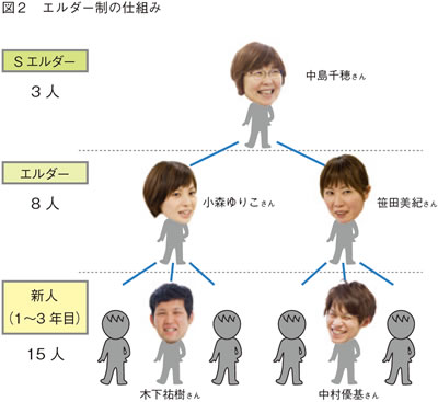 エルダー制は、一人の新人に対して同じ職種の中堅職員がエルダー(指導者)として配置され、技術的なことはもちろん日々の小さな悩みまで相談に乗り面倒を見ます。一人のエルダーは二~三人の新人を担当し、職責者などがスーパーエルダー(Sエルダー)として、新人とエルダーの相談役になります(図2)。エルダーは三年目まで配置され、基本的に同じ職員が続けます。
