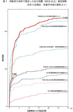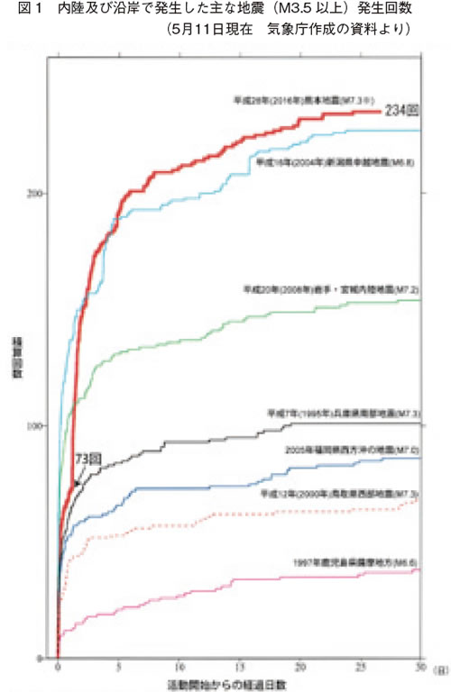 今回の熊本地震には、2つの大きな特徴があります。第一に、震源がつぎつぎに移動したこと。第二に、規模の大きな地震が何度も起きたということです。震度1以上の余震は1500回を超え、M3・5以上の地震は5月11日現在で234回と、中越地震を超えて最多です(図1)。