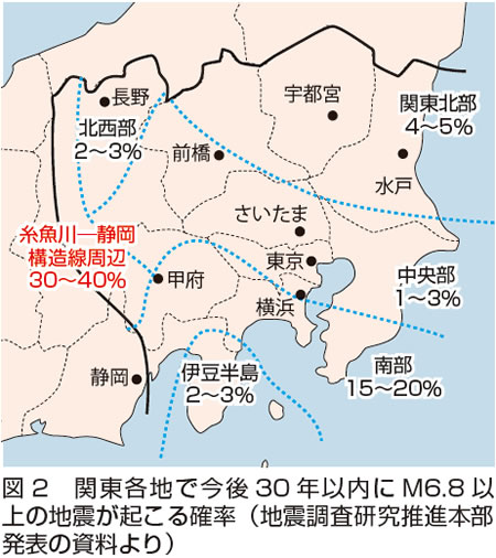 日本は、いつどこで地震が起こるかわからない「地震活動期に入った」と言われます。地震調査研究推進本部が昨年発表した関東地域の長期評価によると、関東全域でM6・8以上の地震が発生する確率は50~60%です(図2)。調査や研究の成果を住民生活にどのように活かしていくか、これはわれわれ研究者にとってもメディアにとっても、大きな課題であり、教訓でしょう。