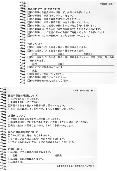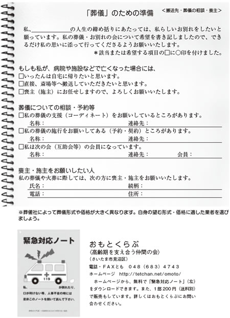 掲載した項目は市民団体「おもとくらぶ」(高齢期を支え合う仲間の会)が作成した「緊急対応ノート」から、葬儀関係を抜粋したものです。これ以外に、通夜や告別式に来てほしい人の名簿、棺の種類や返礼品、祭壇に飾る写真、お礼状の内容なども準備しておきましょう。次回は相続について解説します。