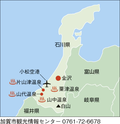 昨年開通した北陸新幹線で東京駅から金沢駅まで2時間半。そこから特急に乗り継げば、30分で加賀温泉駅に到着します。4つの温泉地とは、海側の「片山津温泉」、山側の「山代温泉」と「山中温泉」、北部の小松市に位置する「粟津温泉」で、いずれも車で20分以内の距離。ではさっそく、湯めぐりの旅に出かけましょう。