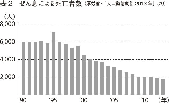 吸入ステロイド剤にはさまざまな種類があります。以前に比べて薬が改良され、夜間に呼吸が苦しくなり、救急車で来院して注射や点滴をおこなうという患者さんは少なくなりました。また、ぜん息で亡くなる方も、減少しています(表2)。