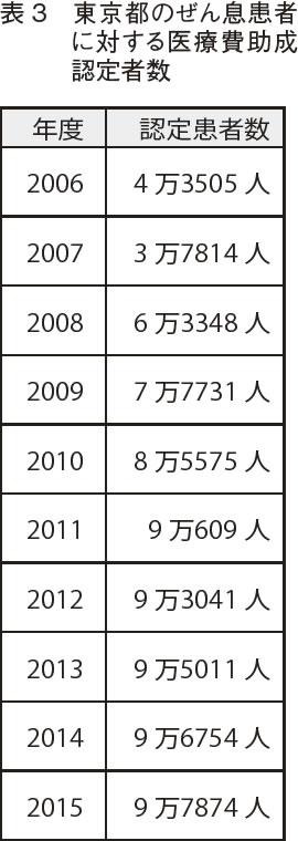 裁判終了後、国・東京都・ディーゼル車メーカー7社による大気汚染医療費助成制度が創設され、東京都在住のぜん息患者の医療費全額助成が実施されました(表3)。