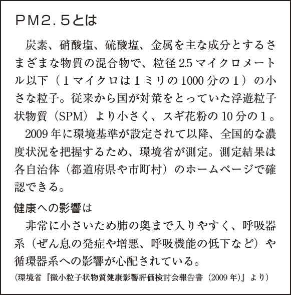 しかし最近では、PM2・5(別項)が環境基準値を超えています。PM2・5によって、「ぜん息などの呼吸器系疾患や循環器系疾患が増える、健康被害が増える」というのが環境省の見解です。環境基準を守るために、今後の対策強化が求められます。